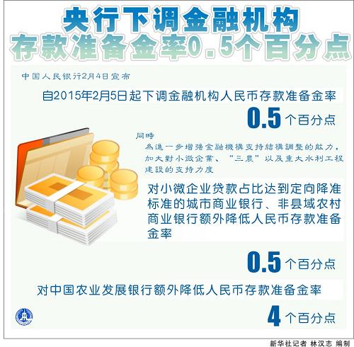 中国人民银行决定,自2015年2月5日起下调金融机构人民币存款准备金率0.5个百分点。同时,为进一步增强金融机构支持结构调整的能力,加大对小微企业、“三农”以及重大水利工程建设的支持力度,对小微企业贷款占比达到定向降准标准的城市商业银行、非县域农村商业银行额外降低人民币存款准备金率0.5个百分点,对中国农业发展银行额外降低人民币存款准备金率4个百分点。
