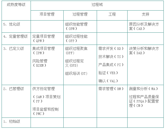 目前,国内大多数企业都选择的是开发模型。开发模型有五个不同的等级,包含22个过程域(PA)。即初始级(ML1)不含过程域,已管理级(ML2)含有7个过程域,已定义级(ML3)含有11个过程域,定量管理级(ML4)含有2个过程域,优化级(ML5)含有2个过程域。每个过程域包含一组专用目标和共用目标。专用目标下包含一组专用实践,共用目标下包含一组共用实践,专用实践下又包含一组子实践和一组典型工作产品等。要完成一个项目通常需要确定两方面的内容:一是工作内容,而是工作方式。专用目标和专用实践体现项目实施过程中的主要工作内容,即为完成一个项目,必须完成的在工程管理和支持方面的最佳实践,各个过程域需要具体分析。共用目标和共用实践则体现项目实施过程中的主要工作方式,目的在于保证当组织结构、人员等发生变化时,也能够持续地采用这些实践。